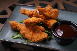 4 pieces of chicken tenders, bbq sauce, honey mustard sauce.