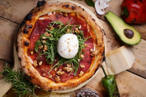 tomato sauce , mozzarella,baby rocca , burrata,walnuts, olive oil .