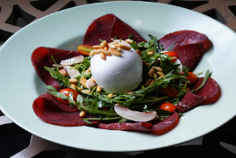 Baby rocca, bresaola,burrata,cherry tomato ,fresh mushrooms, walnuts,olive oil,served with balsamico sauce.