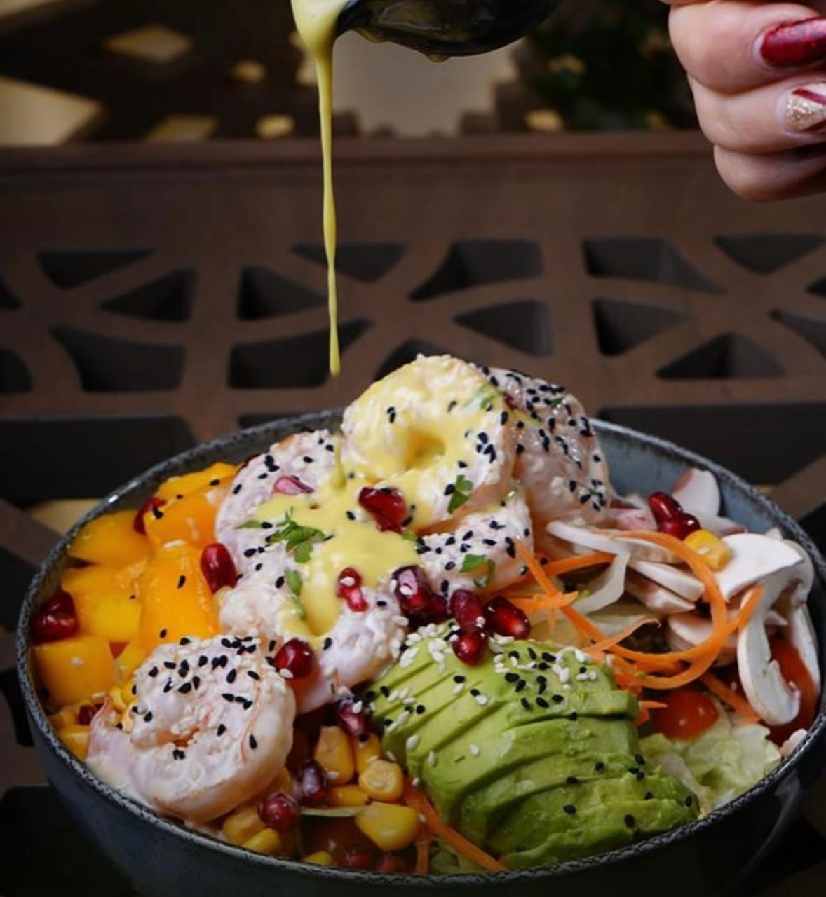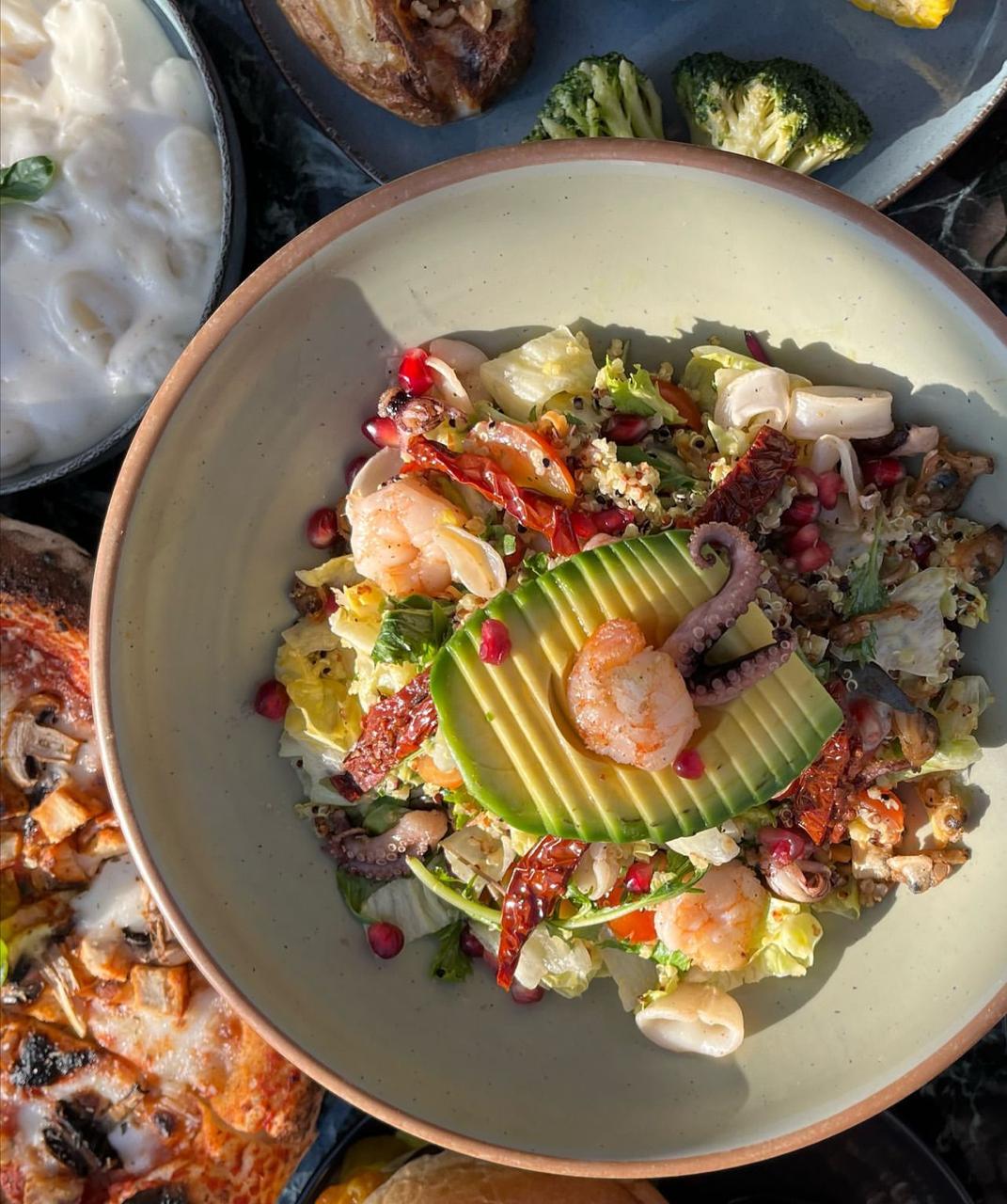 iceberg, Rocca ,mixed green ,carrots, cherry tomato,avocado,mixed sea food , lemon sauce.