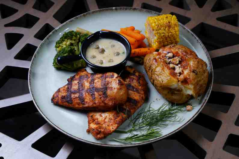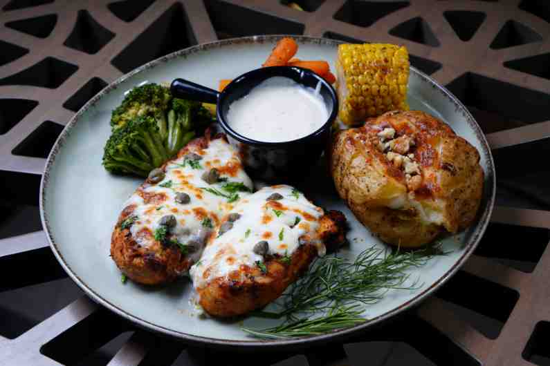 grilled chicken, mozzarella cheese, capre , garlic bainco sauce.